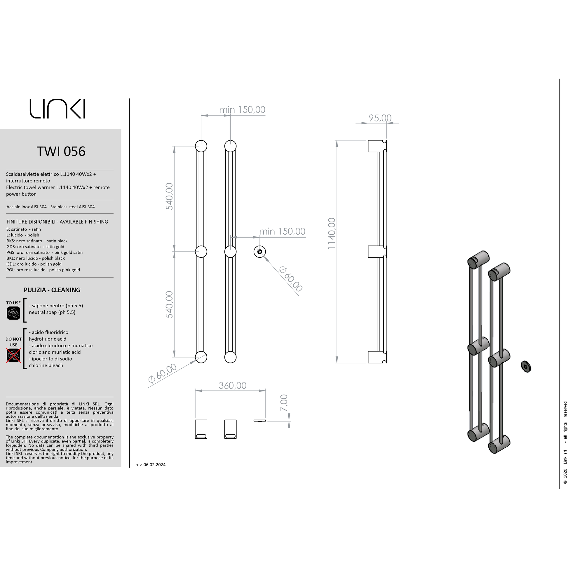 LINKI - Sèche-serviettes électrique L.1140 mm Double avec télécommande TWINS inox TWI056