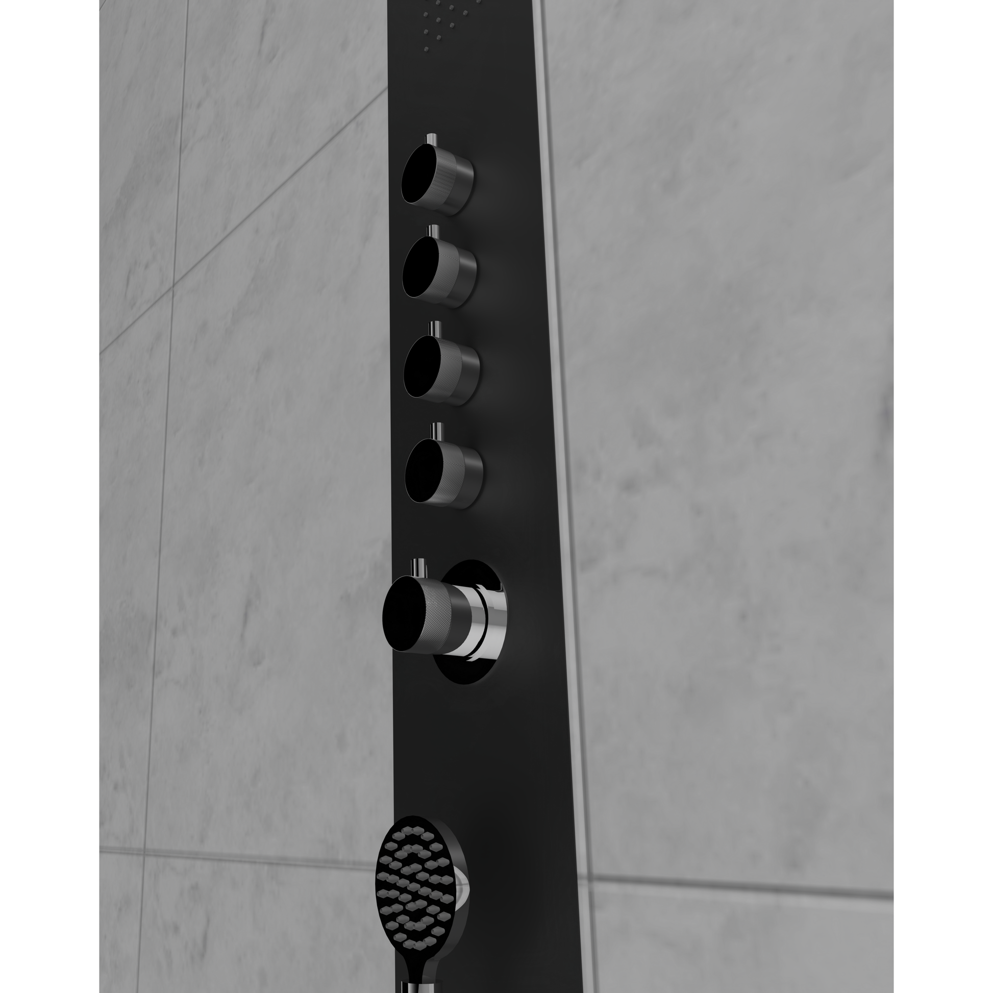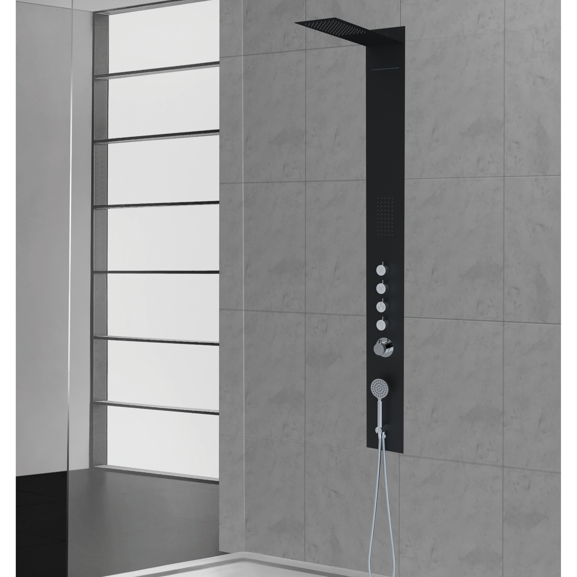 Colonne de douche ENCASTRÉ en acier inoxydable incluant pomme de douche pluie pivotante en acier inoxydable avec buses anticalcaire, bras de douche en acier inoxydable brossé, 1 jet de corps anticalcaire intégré, douchette sucette en acier inoxydable chromé, support mural pivotant pour douchette chromée, 4 contrôles de volume indépendants , thermostatique en polymère Vernet ½ pouce cartouche avec verrouillage de sécurité. Livré avec raccords rapides Pex/cuivre 1/2"