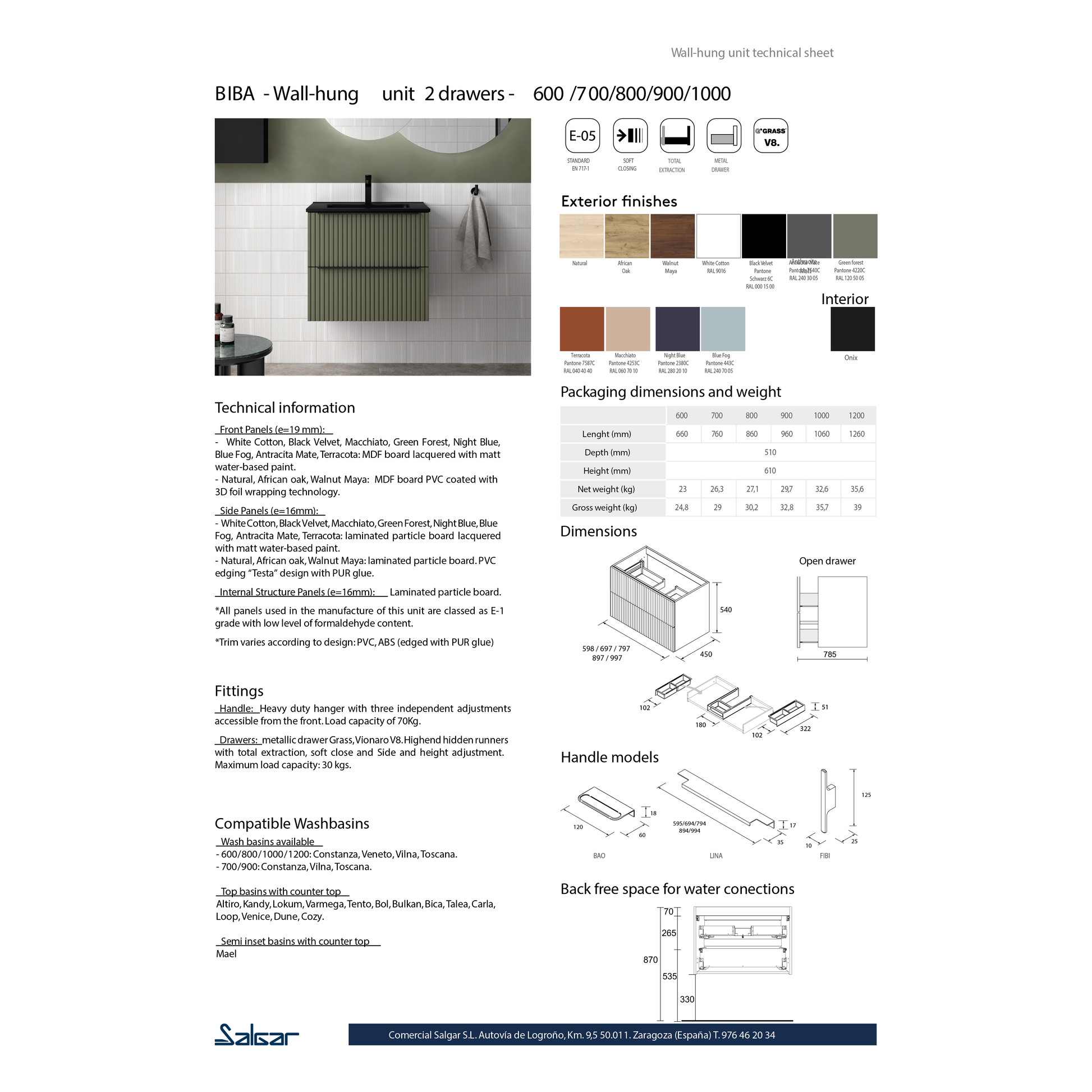 Vanité suspendue BIBA 600 avec 2 tiroirs à fermeture douce, intérieurs en carbone TX