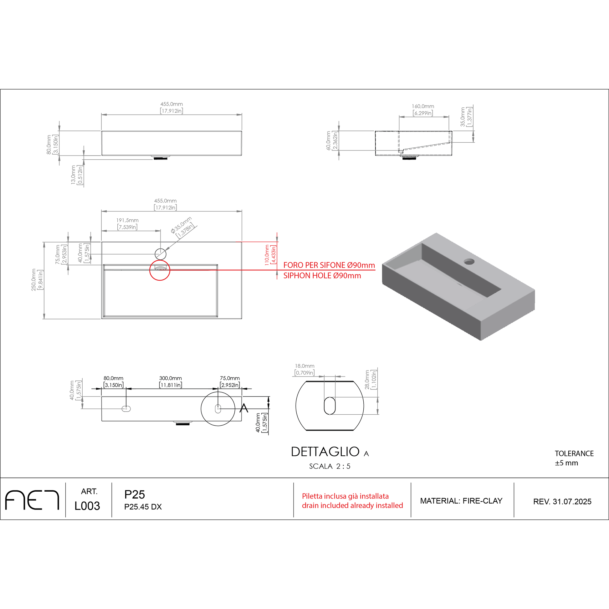 P25 RECTANGULAR WALL-HUNG WASHBASIN L. 455 MM